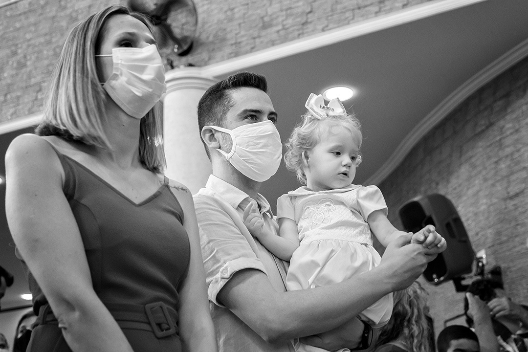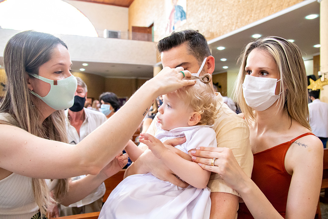 Momento importante na vida dos pais Fábio e Monique no batisado da pequena Isadora.